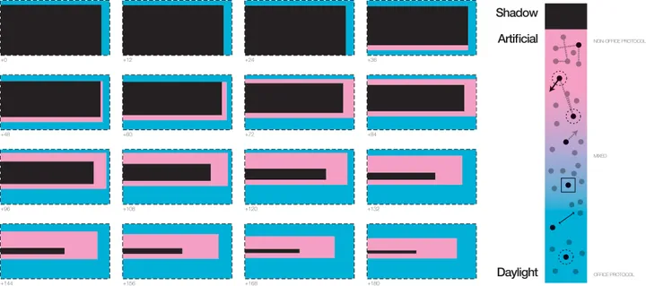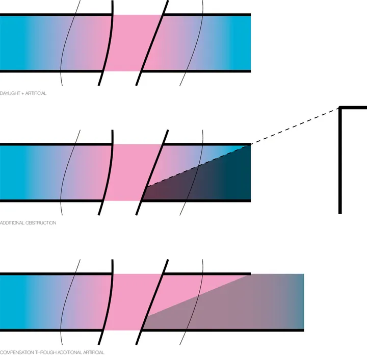 In this project, we attempt to deconstruct and codify the formation of space by the manipulation of natural and artificial light sources. We develop a visual language to measure and express the characteristics of various arrangements of light, from the visual cues of linear arrangements to the expansion of space by revealing a flat surface as a volume of light. We in turn utilize that language to propose a design for an office tower at the corner of Dey and Broadway, meeting both the practical requirements of the project while also utilizing the language to inform the utility of the spaces created through the manipulation of natural and artificial light at the project site.