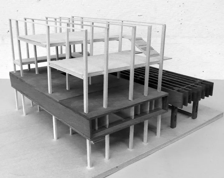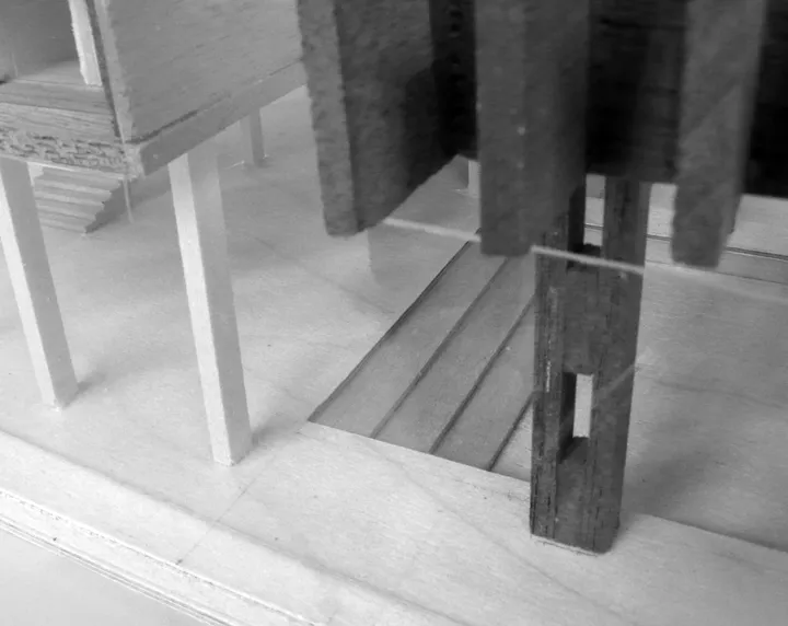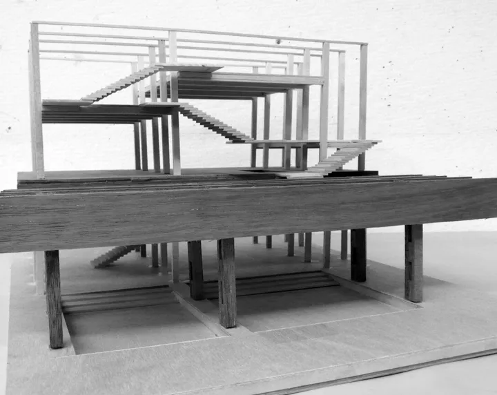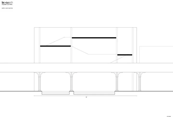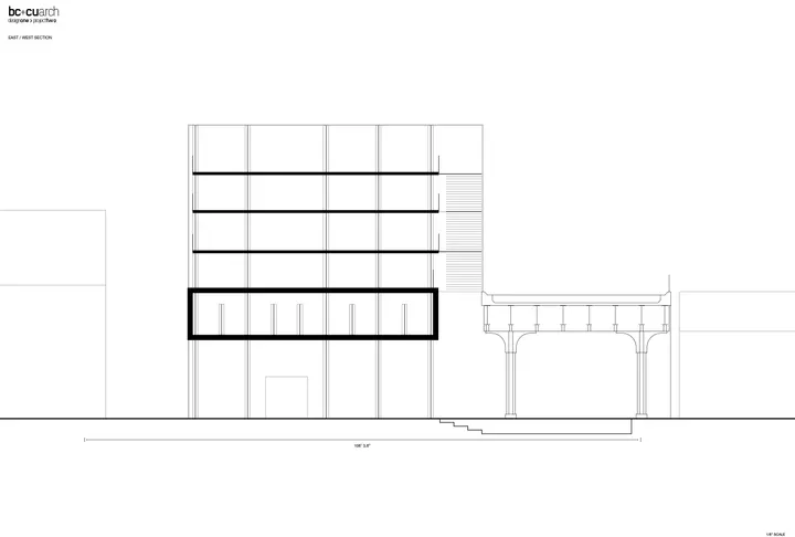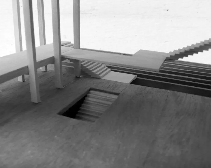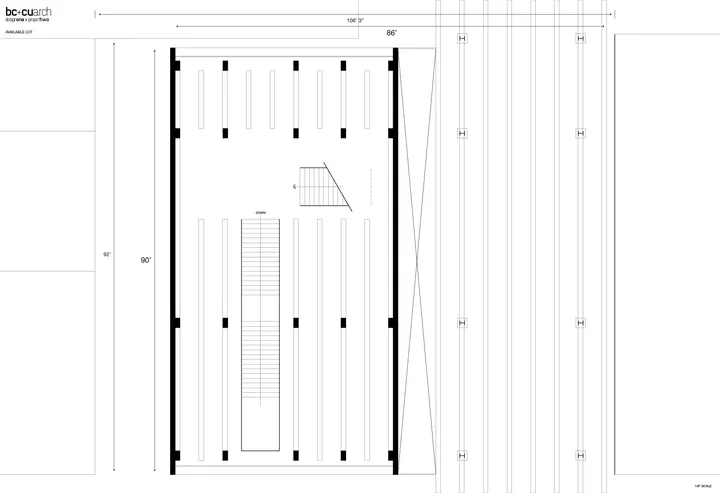 Building upon the grain study of the 116th St project, the High Line echoes the same principles, raising the North-South grain above-ground, allowing W 19th St to epmhasize its own East-West grain with regard to ground traffic and pedestrians. The proposed design negotiates a shift between these two grains, with structural elements drawing from the presence of the High Line. A central structure houses the books, with stacks arranged North and South with respect to the immense structural presence of the High Line. An array of columns draws on the existing vertical beams, drawing out the space found beneath the existing structure. These columns extend upwards through the stacks, creating three mezzanines of varying privacy. A gap between the High Line and the stacks, while distinguishing the two structures, allows for the circulation of light and sound throughout the library. The glass-box enclosure cuts the library at its edge, allowing it to be understood as a cross-section with respect to the greater structure of the High Line.